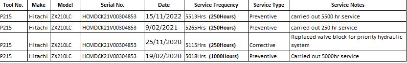 Hitachi Excavator - Zaxis - Model 210 LC5B, year 2016 - 5,630 Hours showing - Service history provided by Vendor. Service records prior to below not available in electronic form.